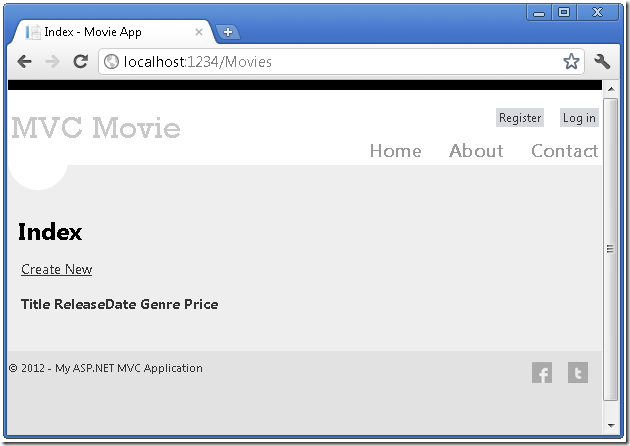 運(yùn)行應(yīng)用程序,通過將/Movies追加到瀏覽器地址欄 URL的后面,從而瀏覽Movies控制器。因?yàn)閼?yīng)用程序依賴于默認(rèn)路由 ( Global.asax文件中的定義),瀏覽器請(qǐng)求http://localhost:xxxxx/Movies將被路由到Movies控制器默認(rèn)的Index 操作方法。換句話說,瀏覽器請(qǐng)求http://localhost:xxxxx/Movies等同于瀏覽器請(qǐng)求http://localhost:xxxxx/Movies/Index。因?yàn)槟€沒有添加任何內(nèi)容,所以結(jié)果是一個(gè)空的電影列表。