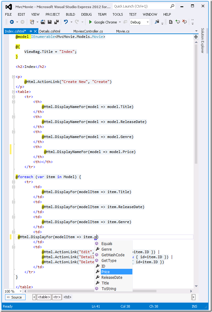 因?yàn)镸odel對(duì)象是強(qiáng)類型的 (是IEnumerableMovie>對(duì)象),所以在循環(huán)中的每個(gè)item對(duì)象的類型是Movie類型。好處之一是,這意味著您可以在代碼編譯時(shí)進(jìn)行檢查,同時(shí)在代碼編輯器中支持更加全面的智能感知: