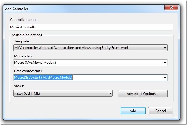 用鼠標(biāo)右鍵單擊Controller文件夾,并創(chuàng)建一個(gè)新的 MoviesController控制器。當(dāng)Build成功后,會(huì)出現(xiàn)下面的選項(xiàng)。設(shè)定以下選項(xiàng):
