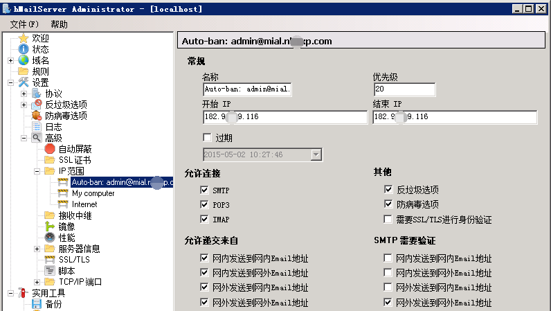 5.配置IP范圍:圖中的Auto-ban是由于我的密碼過于簡單并且在測試時的失敗造成hMailServer自動屏蔽了服務(wù)器的IP,因此需要對該條限制進(jìn)行配置。其他情況下不需要這個步驟。
