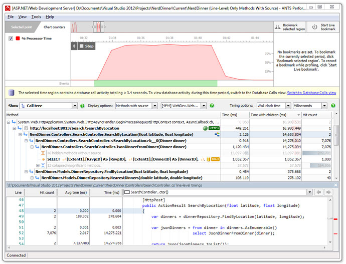 JetBrains dotTrace經過四年漫長的發(fā)展,現(xiàn)在已經是一個包含代碼執(zhí)行跟蹤工具和性能分析工具的套件。它包括dotTrace Performance和dotTrace Memory 兩個工具,dotTrace Performance用來分析代碼性能,比如函數(shù)執(zhí)行時間,調用次數(shù),消耗時間比率等,dotTrace Memory一般用來分析內存占用情況。你可以在本地和遠程系統(tǒng)中對代碼進行跟蹤、采樣或逐行分析。dotTrace對微軟.NET框架的支持一直到4.5.2版本,也可用于分析Silverlight4或5的單機桌面應用程序、Web應用程序、Windows通信基礎(WCF)服務等。新功能包括時間軸分析(timeline profiling)和SQL查詢分析。