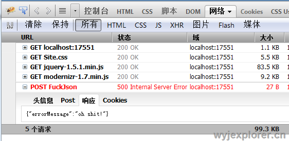 現(xiàn)在請求這個Action,會發(fā)現(xiàn)Response的狀態(tài)已經(jīng)是500了。并且返回了Json格式的錯誤信息。
