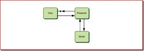 MVP具有很多的變體,其中最為常用的一種變體成為Passive View(被動(dòng)視圖)。對(duì)于Passive View,Model、View和Presenter之間的關(guān)系如下圖所示。View和Modell之間不能直接交互,View通過Presenter與Model打交道。Presenter接受View的UI請(qǐng)求,完成簡(jiǎn)單的UI處理邏輯,并調(diào)用Model進(jìn)行業(yè)務(wù)處理,并調(diào)用View將相應(yīng)的結(jié)果反映出來。View直接依賴Presenter,但是Presenter間接依賴View,它直接依賴的是View實(shí)現(xiàn)的接口。關(guān)于MVP和Passive View基本的常識(shí)性東西,不是本篇文章論述的重點(diǎn),對(duì)此不清楚的讀者相信可以Google出很多相關(guān)的資料來,所以在這里就再多做介紹了。