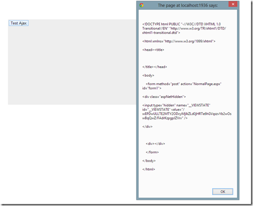 NormalPage.aspx作為請(qǐng)求頁面,先不做任何處理。在Default.aspx頁面中的JavaScript中可以看到testGet函數(shù)就利用jQuery的ajax向Normal.aspx發(fā)送了了一個(gè)get請(qǐng)求,沒寫的參數(shù)使用jQuery默認(rèn)參數(shù),這個(gè)調(diào)用沒使用任何參數(shù),簡單向Normal.aspx頁面發(fā)送請(qǐng)求,請(qǐng)求成功則alert全部response(即success方法參數(shù):result,jQuery會(huì)把responseText傳入success方法第一個(gè)參數(shù)),請(qǐng)求失敗則向DIV中添加一行錯(cuò)誤提示文本。如果一切正常,可以看到頁面彈出對(duì)話框,對(duì)話框內(nèi)內(nèi)容即是Normal.aspx頁面內(nèi)容
