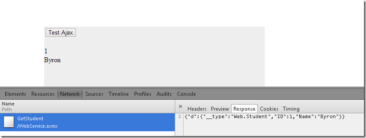 觀察仔細(xì)會(huì)發(fā)現(xiàn)使用ScriptManager和WebService組合有福利,在WebService中傳回Student對(duì)象的時(shí)候并沒有序列化成字符串,而是直接返回,看上面圖發(fā)現(xiàn)對(duì)象已經(jīng)自動(dòng)轉(zhuǎn)換為一json對(duì)象,result結(jié)果可以直接操作,果真非常貼心。而上一個(gè)例子中我們得到的response是一個(gè)json字符串,在客戶端需要用eval使其轉(zhuǎn)換為json對(duì)象。