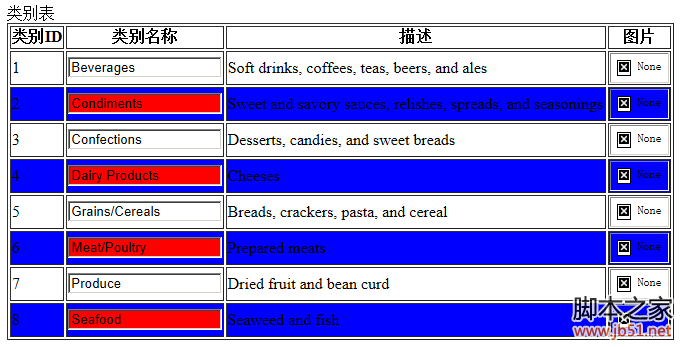 table border="1">th>類別ID/th>th>類別名稱/th>th>描述/th>th>圖片/th>