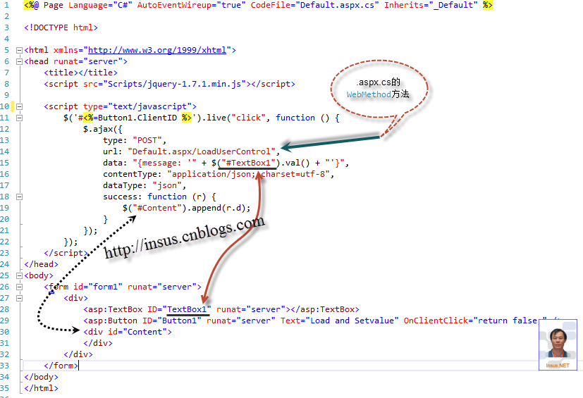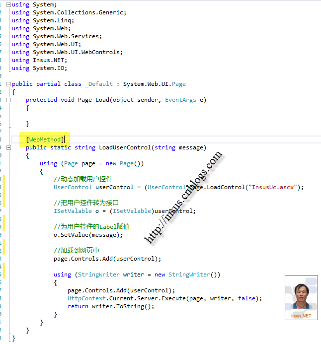 OK,接口與用戶控件創(chuàng)建好了,需要創(chuàng)建網(wǎng)頁了。在.aspx.cs寫一個web method方法: