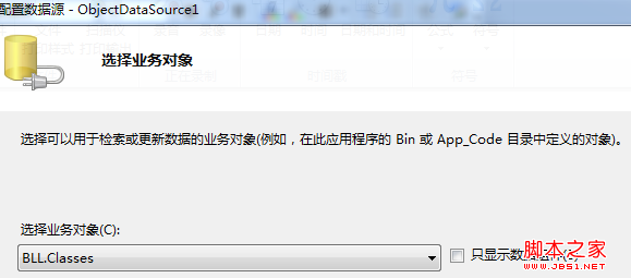 2、點(diǎn)擊控件右上角箭頭“配置數(shù)據(jù)源”彈出對(duì)話框選擇業(yè)務(wù)對(duì)象 即數(shù)據(jù)源需要調(diào)用到的業(yè)務(wù)層方法 比如班級(jí)業(yè)務(wù)對(duì)象 BLL.Classes 下一步