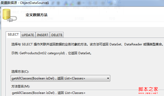 通常手工編寫(xiě)ObjectDataSource太麻煩,微軟比較貼心,我們可以通過(guò)可視化界面來(lái)完成。將ObjectDataSource拖放到界面上,在右上角的智能標(biāo)志上選擇“配置數(shù)據(jù)源”即可進(jìn)行配置。數(shù)據(jù)源類(lèi)一般TypeNameAdapter類(lèi),選中類(lèi),選擇【下一步】,分別選擇對(duì)應(yīng)的獲得、刪除、更新、插入數(shù)據(jù)的方法
