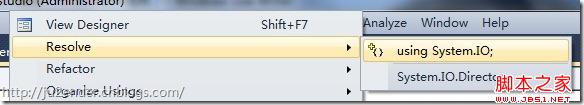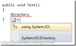 這時(shí)可以看到?jīng)]using System.IO的情況下,Directory是被劃上紅線的,可以注意到開頭出有個(gè)小矩形,鼠標(biāo)移上去,按下后可以看到選項(xiàng):
