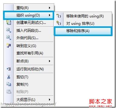 通常創(chuàng)建一個(gè)類,Visual Studio會自動為你引入System、System.Collections.Generic、System.Text,這3個(gè)命名空間,但創(chuàng)建完后不一定需要他們?nèi)?。而?dāng)創(chuàng)建WinForm、WebForm時(shí)會引入更多不需要的命名空間,把它們留著太占位置,Visual Studio早就為我們準(zhǔn)備了這個(gè)功能,在類中右擊鼠標(biāo),選擇:“組織using” > “移除和排序”,即可移除不需要的命名空間,并按英文字母正序排列各命名空間。