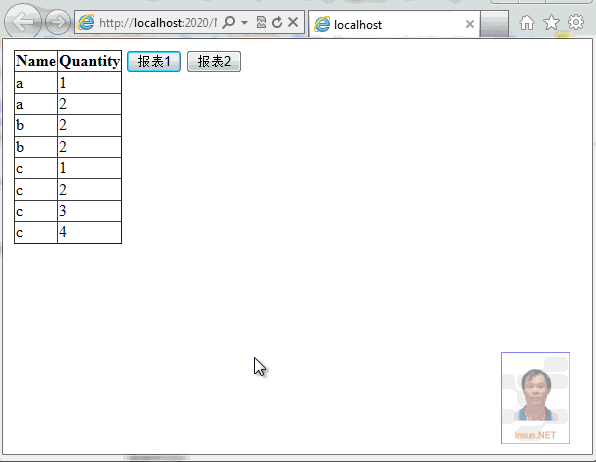 接下來,完成第二個報(bào)表,在Insus.NET使用Repeater包含Repeater來實(shí)現(xiàn)。因此,前臺Html代碼如下,其中第一個Repeate內(nèi)放置了一個HiddenField,來存儲名稱(Name)字段,當(dāng)作子Repeater的參考傳入。