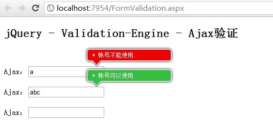 本文主要內(nèi)容是:在ASP.NET中實(shí)現(xiàn)AJAX驗(yàn)證功能。官方給出的Ajax驗(yàn)證例子是PHP的實(shí)例,筆者在網(wǎng)站查閱的資料基本都是翻譯的官網(wǎng),在ASP.NET中實(shí)現(xiàn)普通驗(yàn)證是沒(méi)有問(wèn)題的。但是,不能實(shí)現(xiàn)Ajax驗(yàn)證,這應(yīng)該是個(gè)bug。筆者研究了插件代碼,給出我自己的一種解決方案,要在ASP.NET實(shí)現(xiàn)這種效果,必須修改官方的主JS文件,當(dāng)然同學(xué)們可以根據(jù)筆者的思路進(jìn)行挖掘,歡迎補(bǔ)充!實(shí)現(xiàn)效果見(jiàn)下圖: