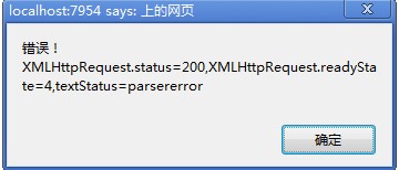 alert("錯(cuò)誤!XMLHttpRequest.status=" + XMLHttpRequest.status + ",XMLHttpRequest.readyState=" + XMLHttpRequest.readyState + ",textStatus=" + textStatus);