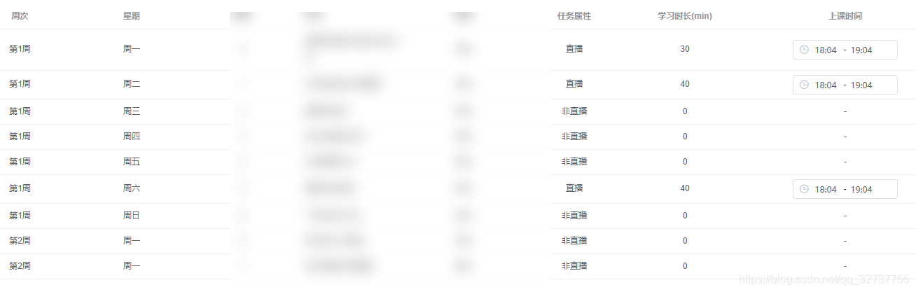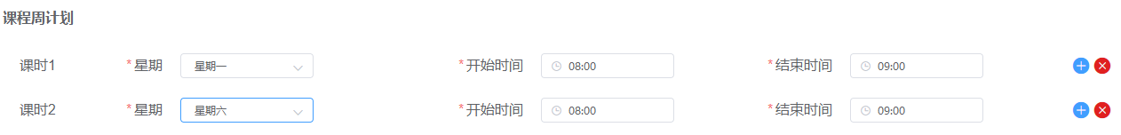 固定每周的固定時間上課(例:共上20節(jié),每周六、周日早上8點-10點上課。假如今天周六凌晨1點,那么排課也需要從今天開始)總共上幾個周,每周上課時間比較個性化(例:共上三周,第一周周一周二早上8點-10點上課;第二周周三周四下午8點-10點上課;第三周周日中午11點-12點上課。)