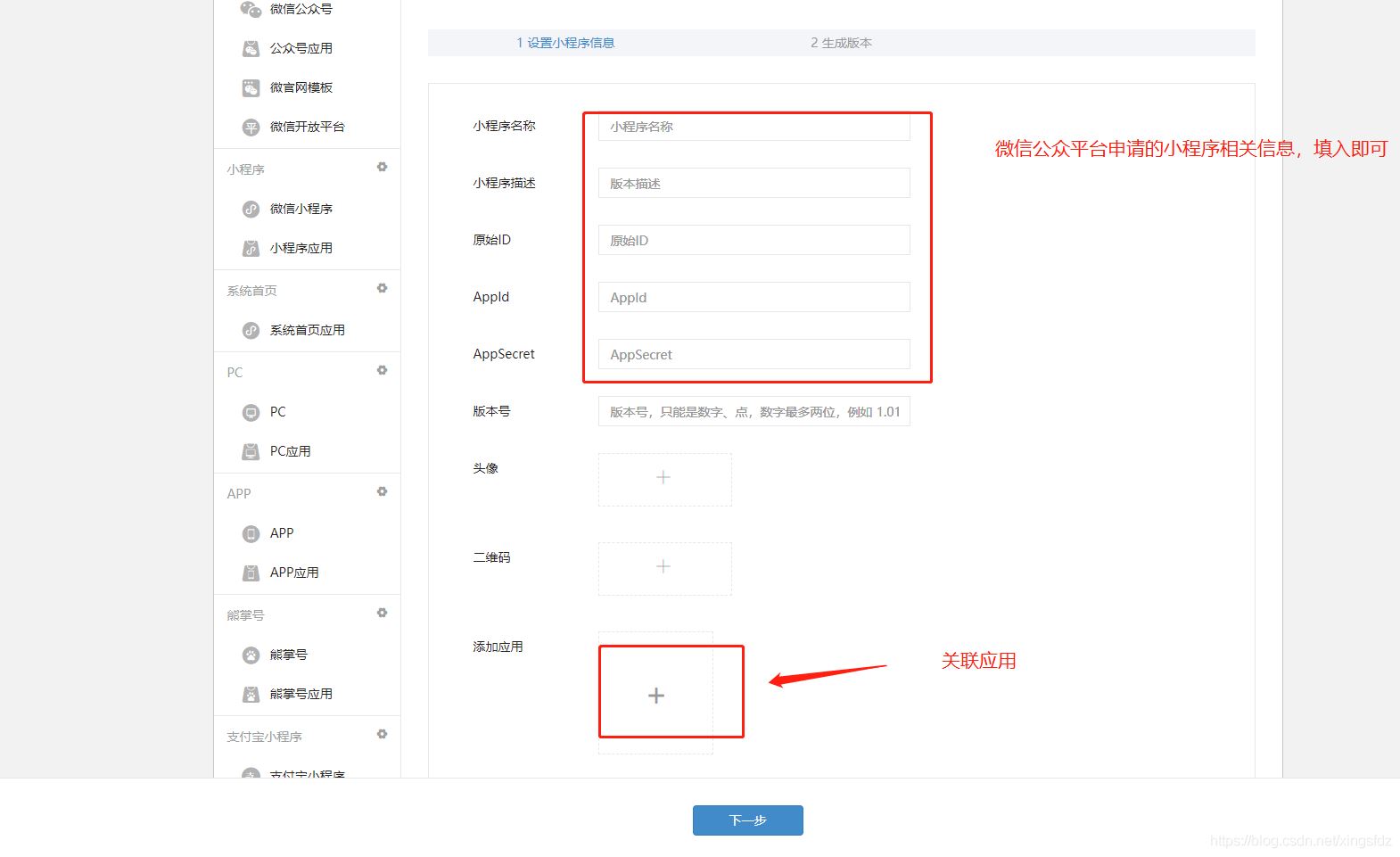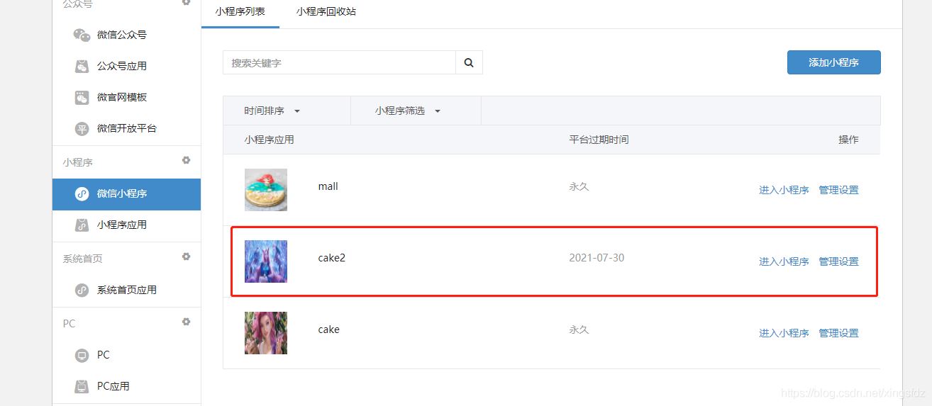 由于我這邊是配置微信小程序 所以 點擊微信小程序->添加小程序: