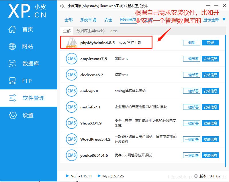 因為需要基于LNMP,所以需要安裝nginx mysql php,這里強力推薦使用寶塔工具,一鍵操作安裝,很方便。