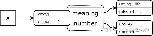 那么$a的內(nèi)部存儲為 , “l(fā)ife” 的ref_count變成2 , 42的ref_count是1: