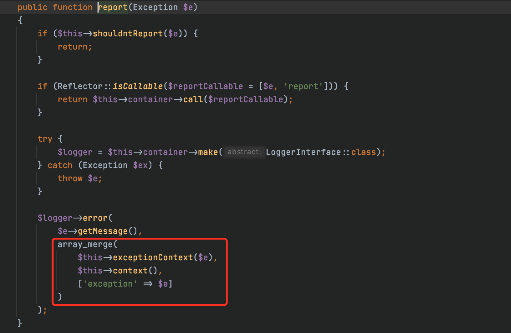 首先我們看一下框架的report方法,代碼在(src/Illuminate/Foundation/Exceptions/Handler.php),我用紅框框起來的代碼就是調(diào)用棧信息,我們在重寫這個方法時只需要完全拷貝這個方法里的所有代碼到我們自定義的report方法里,然后把紅框里的代碼去掉即可