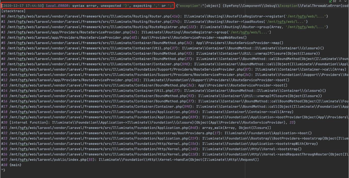 對于上面的修改做一下說明,laravel的$dontReport屬性的異常類都不會被上報,因為客戶端錯誤信息我們不需要記錄,所以將其添加到$dontReport屬性里,并且在render方法里把異常大概分為了兩大類,一大類就是客戶端異常,另一大類就是服務(wù)器異常,我們把服務(wù)器異常統(tǒng)一code為500,錯誤信息為服務(wù)器錯誤,將真實的錯誤信息記錄在了錯誤日志里,避免把服務(wù)器信息暴露給了客戶端。