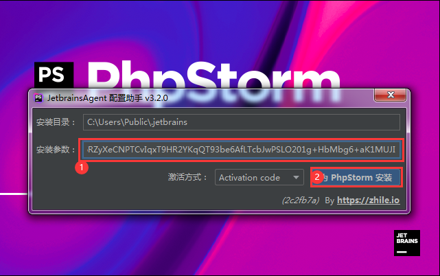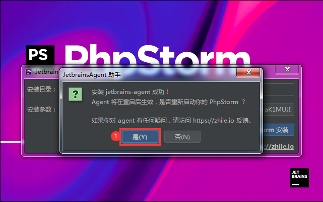 在下載的phpstorm永久激活補(bǔ)丁文件夾中有個(gè)叫做"安裝參數(shù).txt"的文件,打開(kāi)此文件把里面的內(nèi)容復(fù)制到上圖標(biāo)注1處的輸入框中,然后點(diǎn)擊上圖標(biāo)注2處“為phpstorm安裝”按鈕彈出“安裝jetbrains-agent成功”提示窗口如下圖