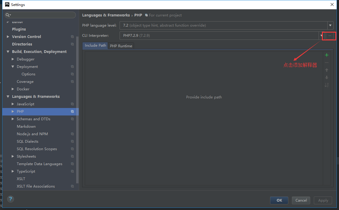 2)File - setting - Languages Frameworks,配置 PHP 版本、interpreter信息;