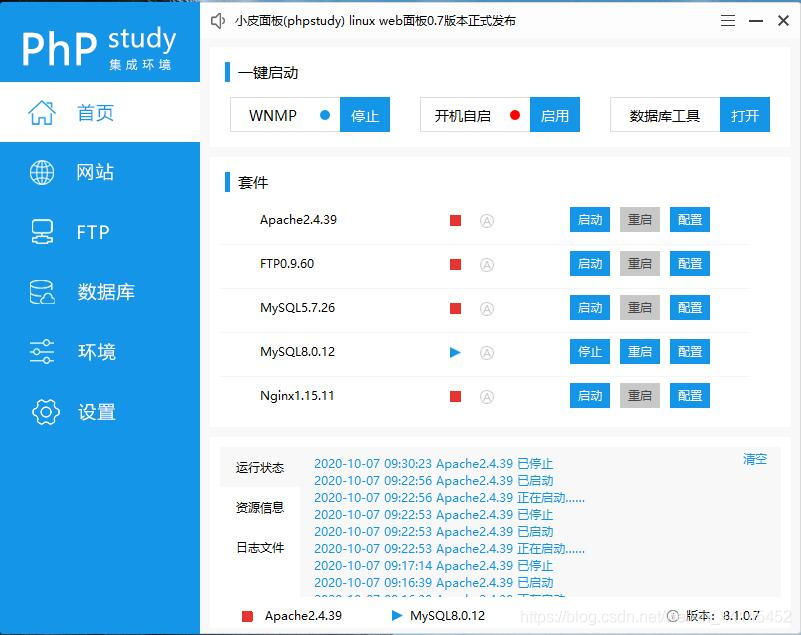 在首頁->套件位置啟動(dòng)Apache2.4.39(如果Apache版本是其他的也可以啟動(dòng)),啟動(dòng)之后會(huì)有一個(gè)綠色的三角按鈕