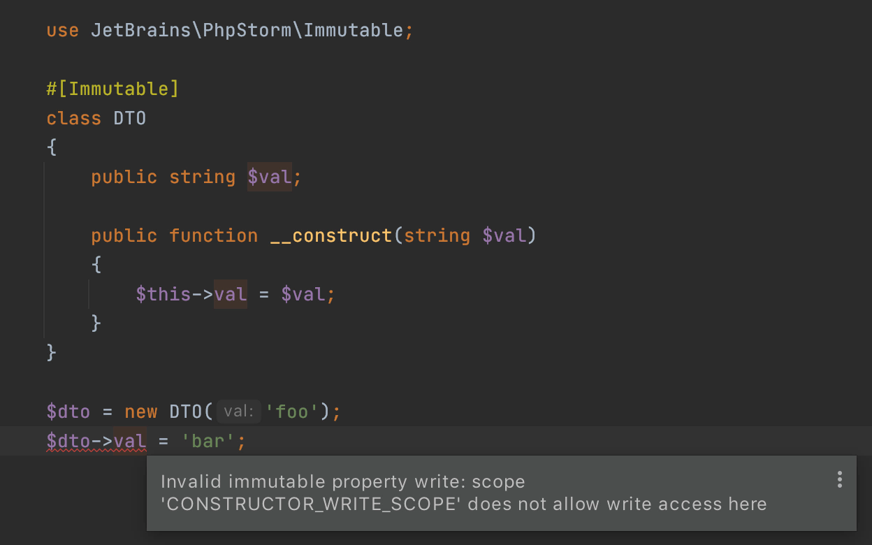 可以使用getter和setter或魔術(shù)方法在某種程度上模擬不可變的對(duì)象。從PhpStorm 2020.3開始,您可以簡單地用#[Immutable]屬性標(biāo)記對(duì)象或?qū)傩浴?/p>