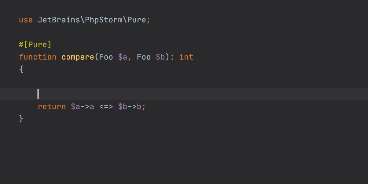 在PhpStorm 2020.3中,一些屬性將在\JetBrains\PhpStorm\命名空間下可用。#[ExpectedValues]和#[NoReturn]是.phpstorm.meta.php函數(shù)的高級(jí)后裔。而#[ArrayShape]是PHPDoc的數(shù)組描述的一個(gè)備受期待的進(jìn)化。此外,還會(huì)有#[Deprecated]、#[Pure]和#[Immutable]。