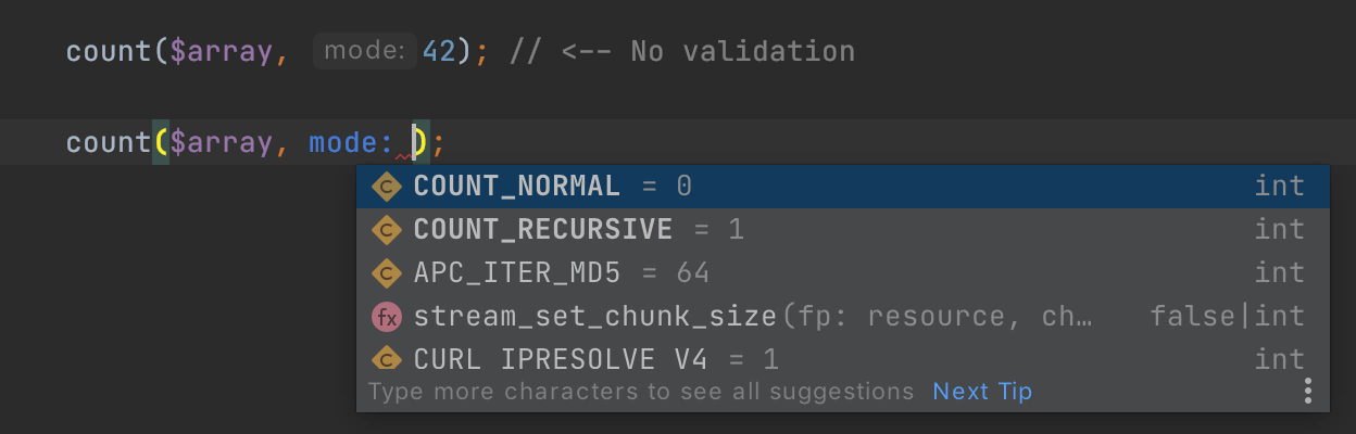 這與expectedArguments()函數(shù)可以執(zhí)行的操作類似.phpstorm.meta.php,不同之處在于meta版本更像是完成對(duì)手。相反,該屬性假定參數(shù)或返回值沒有其他可能的值。