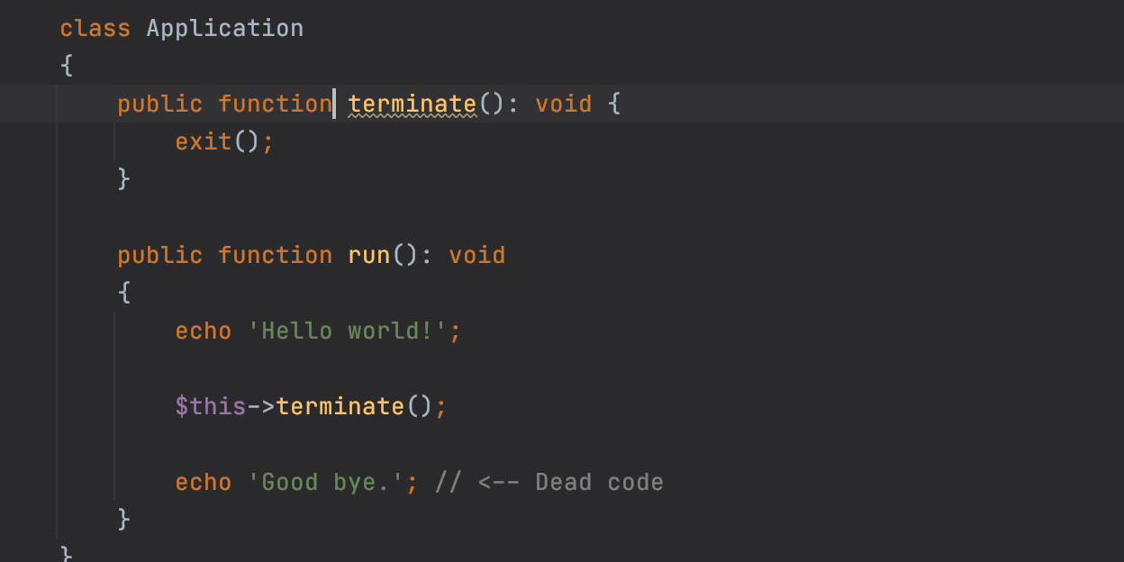 代碼庫中的某些功能可能會(huì)導(dǎo)致腳本執(zhí)行停止。首先,從函數(shù)名稱中并不總是很明顯,例如,trigger_error()根據(jù)第二個(gè)參數(shù)可以停止執(zhí)行。其次,PhpStorm不能總是檢測(cè)到此類功能,因?yàn)樯钊敕治隹赡軙?huì)導(dǎo)致性能問題。