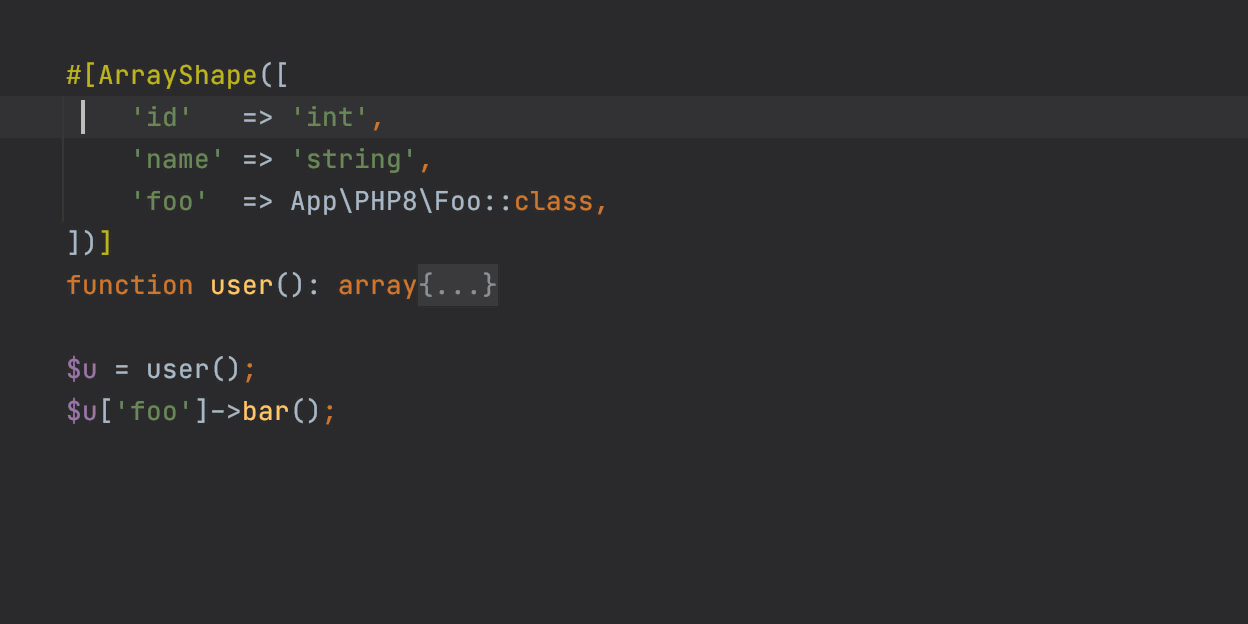 與PHP解釋器不同,PhpStorm仍然會(huì)分析屬性!因此,即使您的項(xiàng)目在PHP 7.4或更低版本上運(yùn)行,您仍然可以從添加#[ArrayShape]屬性中受益。