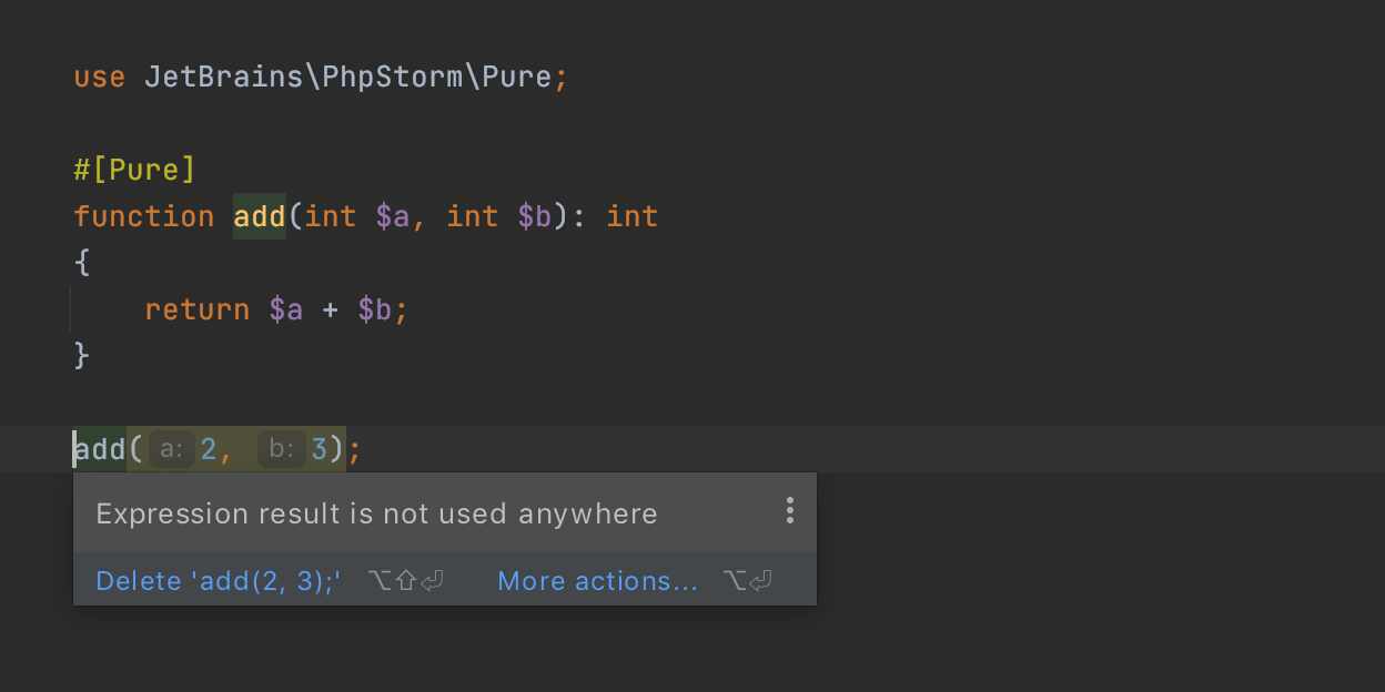 如果該函數(shù)被標(biāo)記為pure函數(shù),但您嘗試在函數(shù)外部進(jìn)行更改,即產(chǎn)生副作用,則PhpStorm將警告您并突出顯示不安全的代碼。
