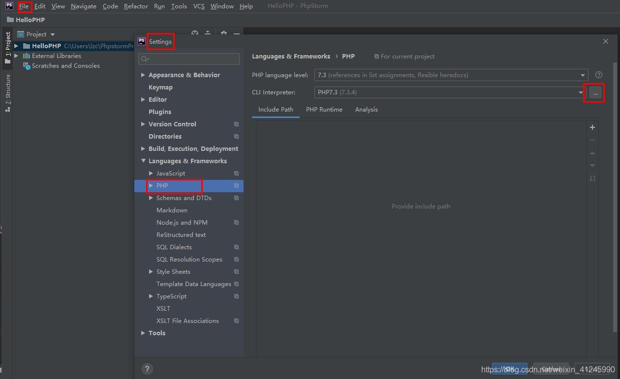 我們點(diǎn)擊“File->Settings”菜單進(jìn)行PHP版本配置,使用和phpstudy對(duì)應(yīng)的版本PHP7.3.4。