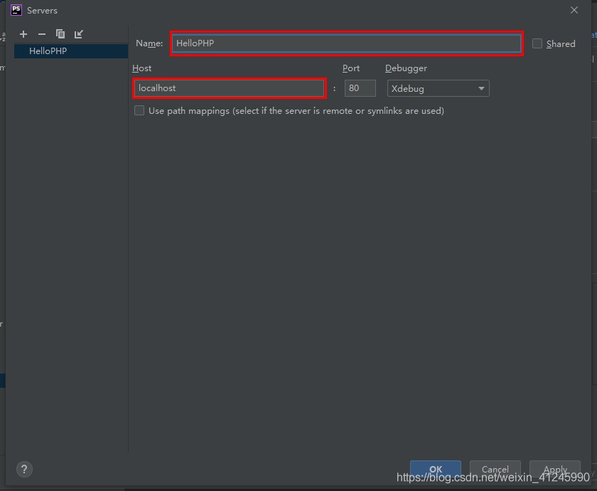 IED key輸入剛剛php.ini文件中xdebug.idekey的值,Host、Port是File->Settings->LanguagesFrameworks->PHP->Servers中設(shè)定的Host、Port值,具體配置如下圖: