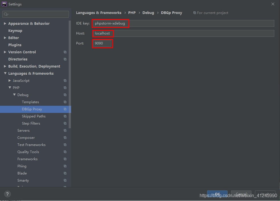 2)選擇File->Settings->LanguagesFrameworks->PHP->Debug->DBGp Proxy,