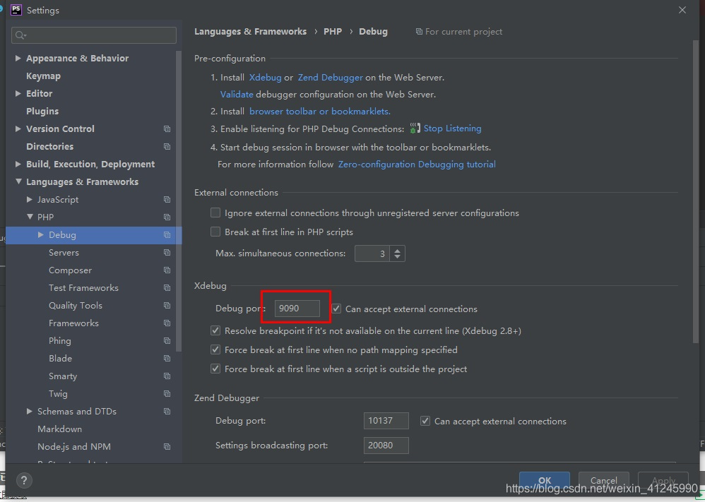 1)選擇File->Settings->LanguagesFrameworks->PHP>Debug,找到XDebug選項(xiàng)卡,Debug port 輸入的是剛剛php.ini配置文件當(dāng)中xdebug.remote_port的值,具體配置如下圖: