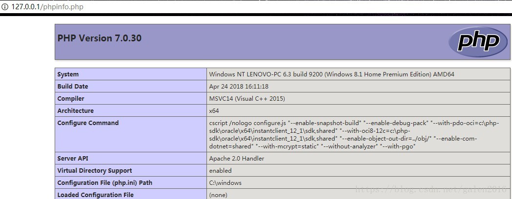 保存后,在瀏覽器輸入127.0.0.1/phpinfo.php,回車,出現(xiàn)關(guān)于PHP的版本信息,如下圖: