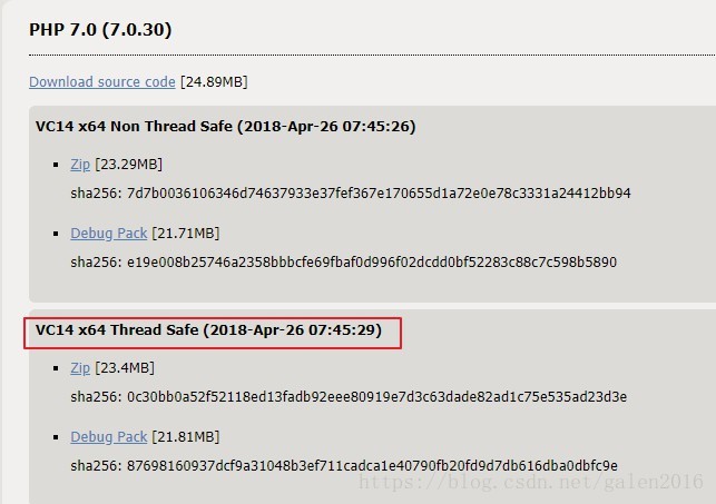 1、下載PHP壓縮包,地址:https://windows.php.net/download ,我下載的是PHP7.0 Thread Safe 版本,如下圖: