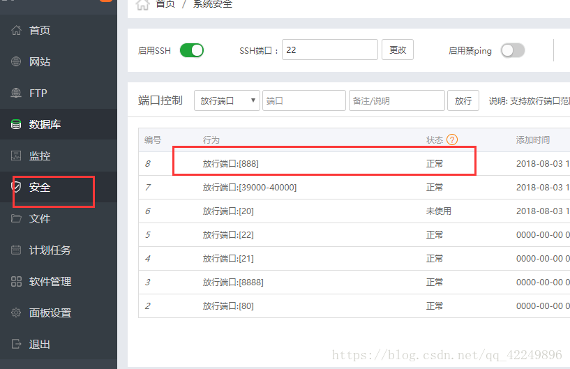 當我們進phpmyadmin的時候,端口默認為888,這時,我們就要檢查寶塔面板和阿里云(我是在阿里云買的服務(wù)器?;蝌v訊云等)控制器里的安全組的888端口是否開放。
