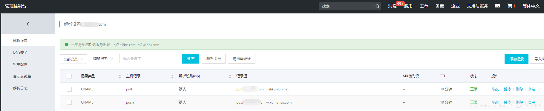 添加完成之后進(jìn)行域名解析配置這兩個(gè)域名的CDN加速指向分配的CNAME.