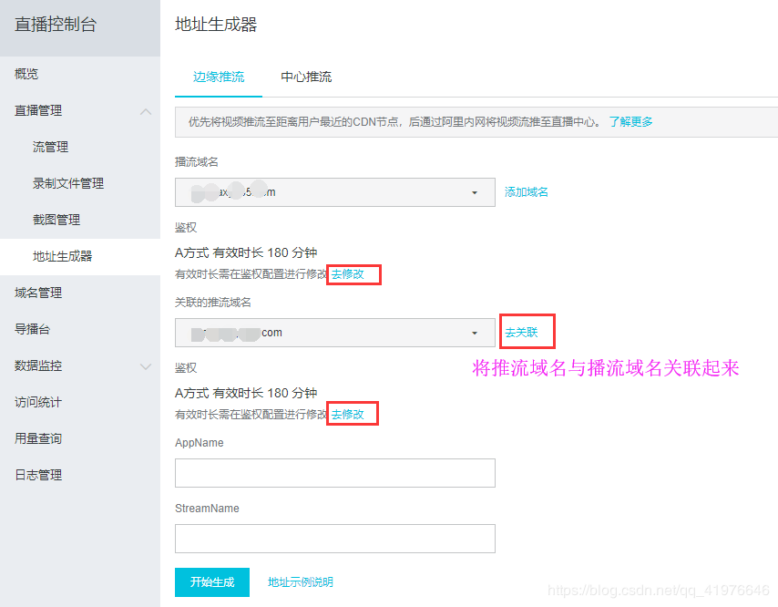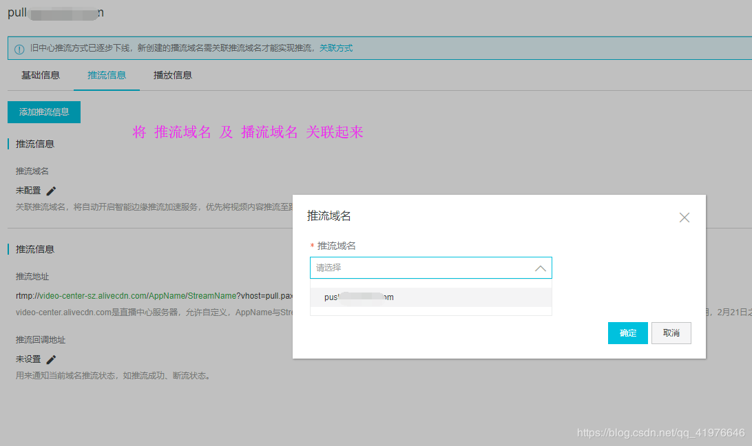 然后配置將它們兩個(gè)域名(一個(gè)推流,一個(gè)播流)關(guān)聯(lián)起來.