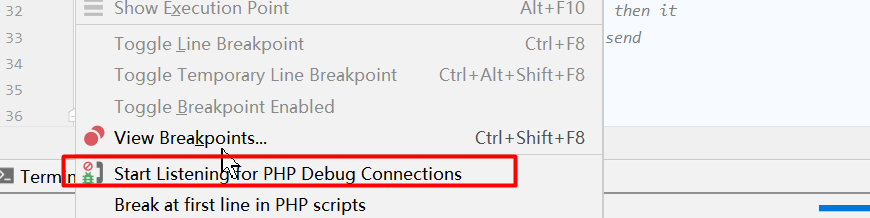 RUN->Start Listening for PHP debug connections->打斷點(diǎn)->debug