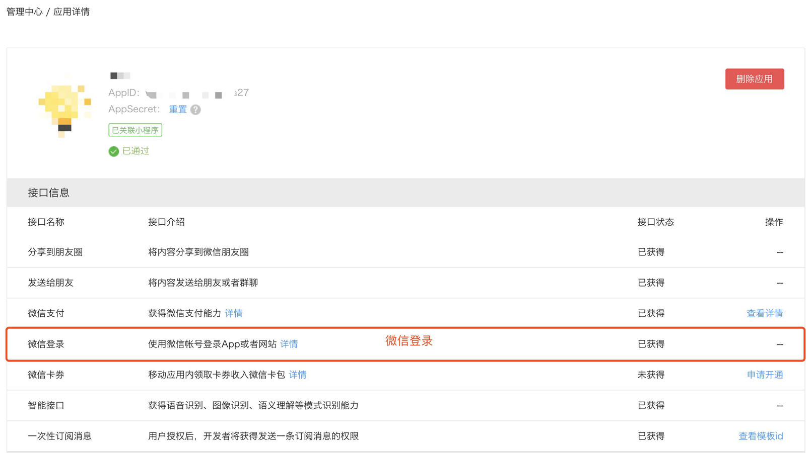 | secret | 是 | 應(yīng)用密鑰 AppSecret,在微信開放平臺提交應(yīng)用審核通過后獲得 | |
