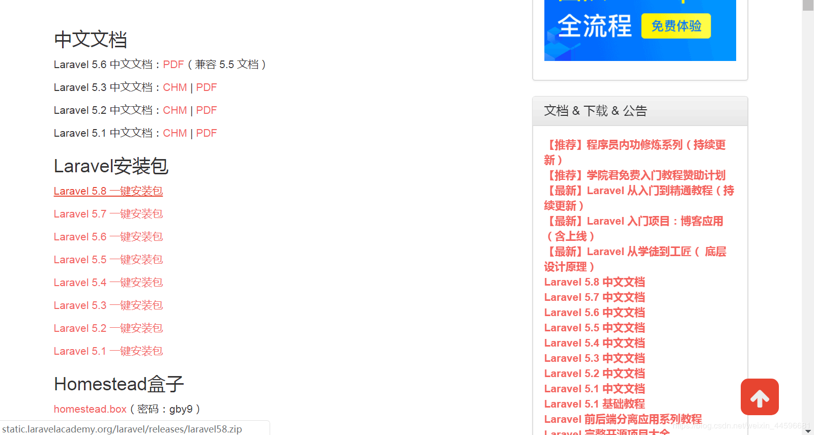 首先,我們先點擊這個鏈接 https://laravelacademy.org/resources-download 跳轉至Laravel學院的資源下載,然后我們點擊一鍵安裝包,
