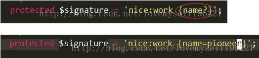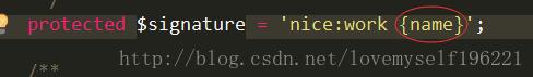 到此我們就完成了一個(gè)自定義命令的添加 ,但是 還有種情況就是需要在命令行后面添加參數(shù) ,那么我們可以這樣做 ,在 $signature屬性中 假如 該屬性 如圖