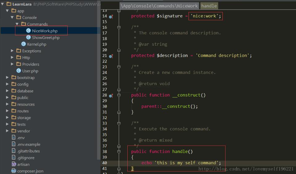 4. 然后進(jìn)入 NiceWork.php ,修改$signature 屬性 為你想要的命令 比如 ‘NiceWork',然后 在handle()方法中編寫你的邏輯,如下圖