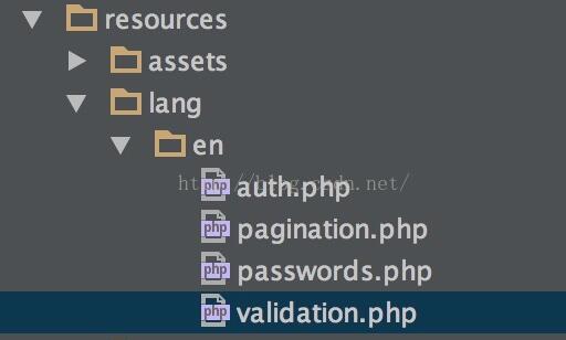 在項(xiàng)目中找到“resources”目錄下的“l(fā)ang” 中的 “en”文件夾中的“validation.php”文件,