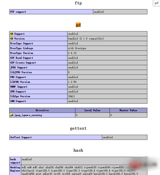 在瀏覽器中訪問到第一步中新建的phpinfo.php文件。Ctrl+F查詢gd,如果有出現(xiàn),就表示gd2庫已經(jīng)加載了,如果驗證碼還是不顯示,請繼續(xù)看下一步。