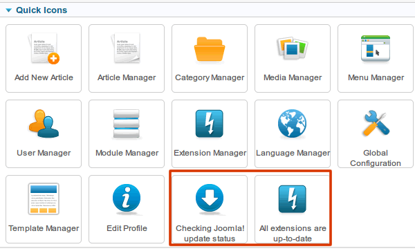 每次登陸joomla后臺,joomla都會去檢查是否有更新(檢查成功后cache,默認保存該cache 6小時),而且分為joomla主程序和joomla擴展兩個部分,如下圖: